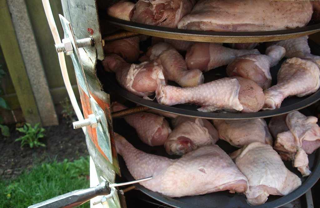А теперь можно развешивать крючки, ставить противни и раскладывать продукты для копчения. Распаливайте костёр и ожидайте вкусных деликатесов.