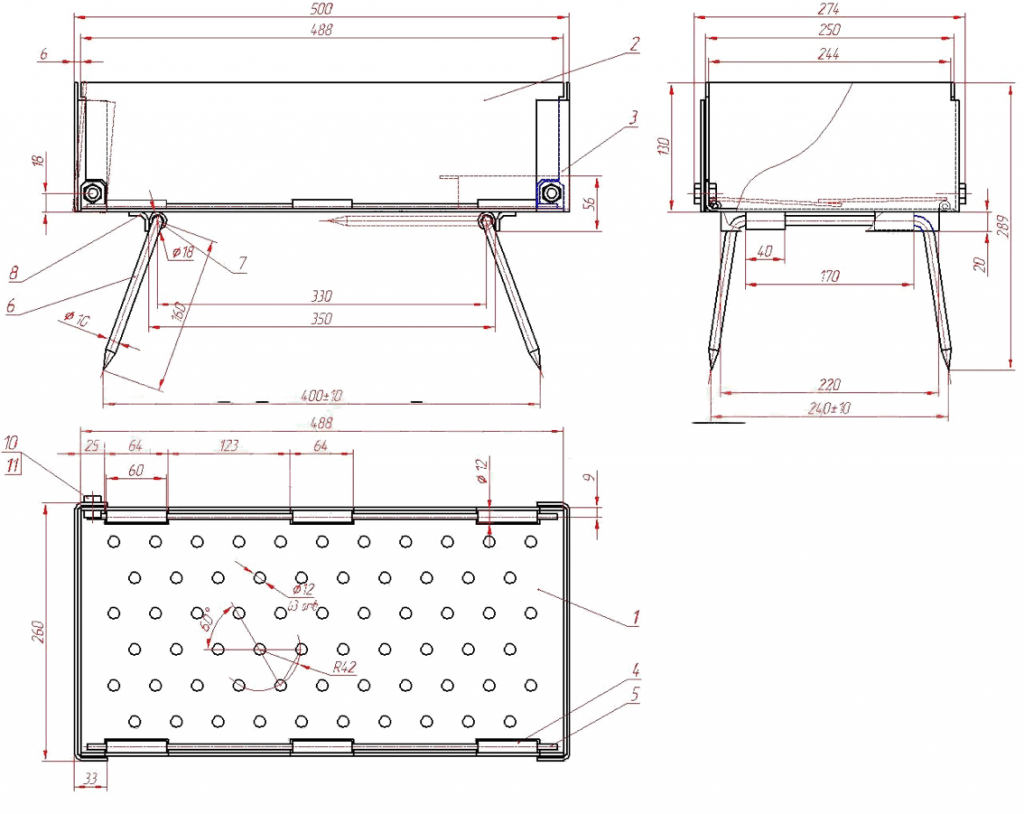 - под: стальной прямоугольный лист для углей с просверленными отверстиями, через которые вниз будет осыпаться зола, чтобы обеспечить периодическую выемку золы, приделается съемным;