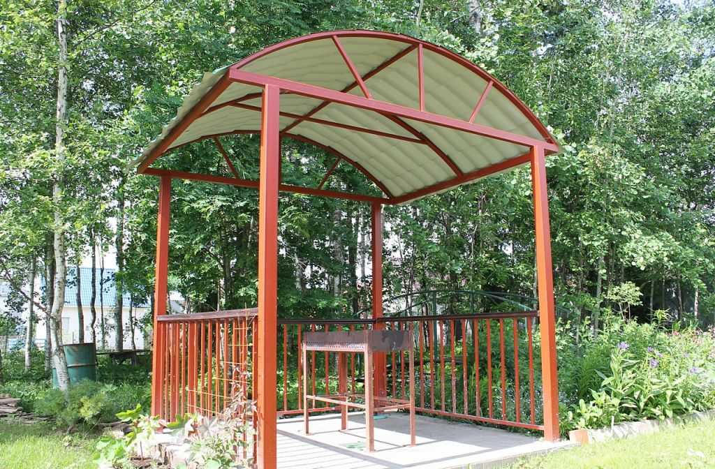 Великолепное изделие можно получить, используя в качестве материала для него профильную трубу в сочетании с каким-либо кровельным материалом, скажем, поликарбонатом. Причём здесь есть возможность создать такую беседку, которая будет не только иметь привлекательный облик, но и минимальный вес, для чего достаточно грамотно подойти к выбору металлопроката различного сечения.