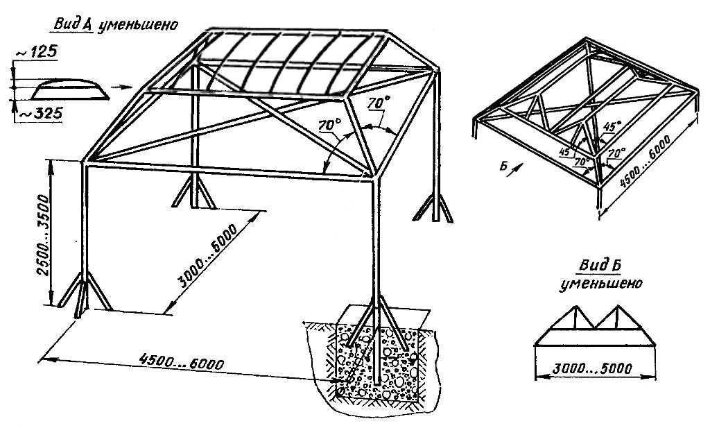 Нажмите на чертеж, чтобы увеличить схему Для того чтобы уменьшить нагрузку на узел крепления, внутри швеллера приваривается полка, на которую опирается основание столба. Опоры выставляют вертикально по уровню и связывают между собой планками. В верхней части столбов делают L-образные вырезы, нижние полки которых будут основанием горизонтальному брусу. На нем, в месте крепления, оборудуют сквозной паз. Размеры их должны быть такими, чтобы при соединении плоскости брусьев заходили заподлицо. Крепление этих элементов выполняют болтами. Выступающие концы украшают фигурными вырезами. Горизонтальные несущие элементы будут являться опорами для стропил. Брусья поддерживаются раскосами, которые опираются на опоры. Подробнее можете посмотреть на видео: