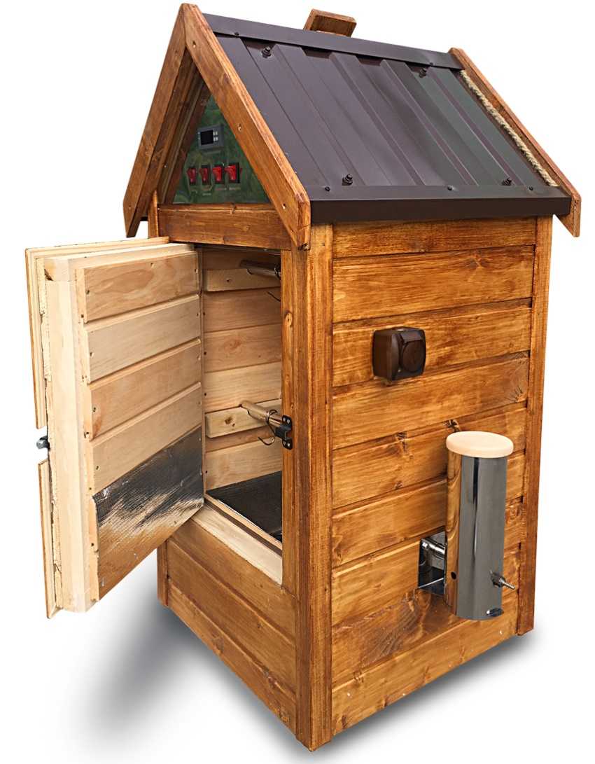 Процесс горячего копчения довольно быстрый, и подача дыма происходит от горящей щепы, поэтому и конструкция отличается. Главное создать герметичность и равномерный прогрев всех ярусов коптильни.
