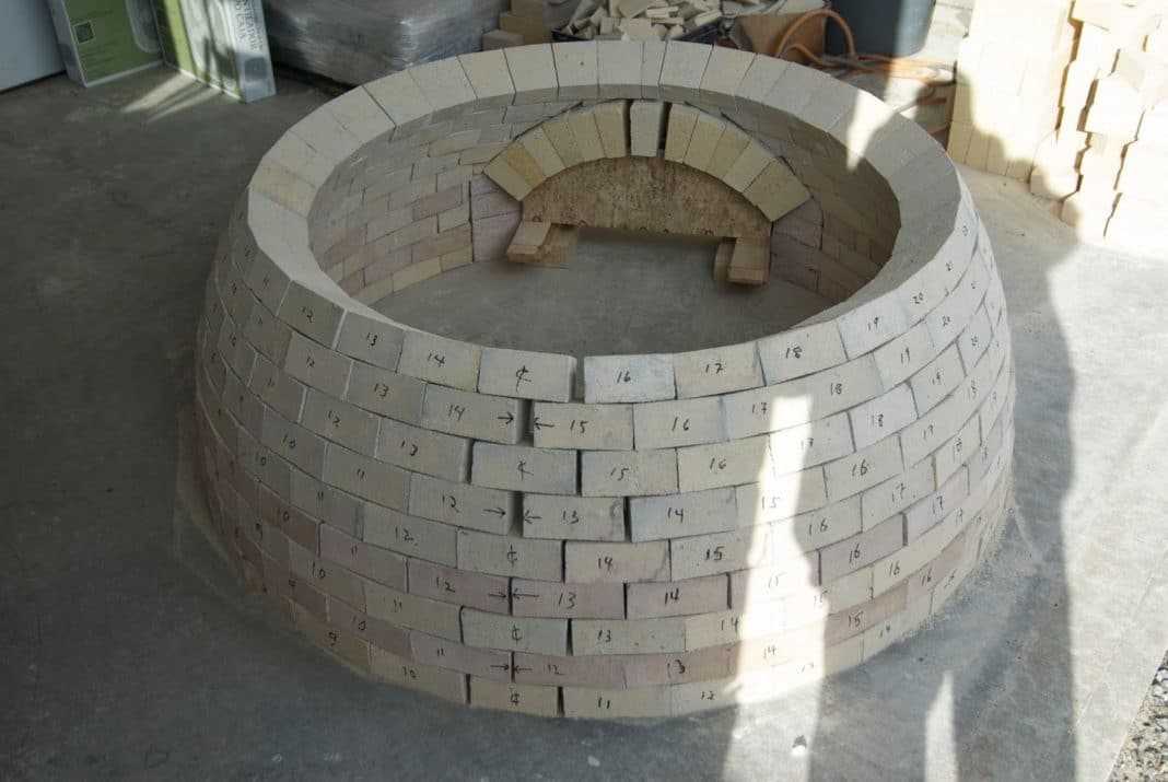 Далее выкладывают второй ряд, с половинным сдвигом кирпичей, укладывают колосники и продолжают кладку. Восьмой ряд выкладывают с 0,5 см сдвигом кирпичей, и такой сдвиг должен быть в каждом ряду – верх тандыра должен иметь куполообразную форму. В результате при диаметре основания 1 м горловина печи должна иметь диаметр 0,5 м.