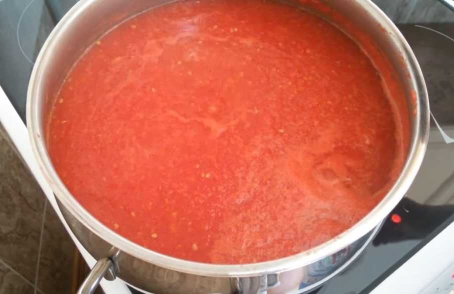 3. Перелить в кастрюлю, добавить гвоздику и корицу и довести до кипения. Проварить еще 10-15 минут на среднем огне. Во время приготовления томатной массы нужно периодически помешивать ее и снимать пенку.