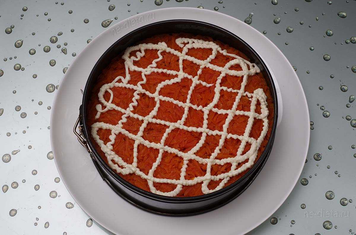 Далее положить тертую морковь, слегка посолить ее и смазать майонезом.