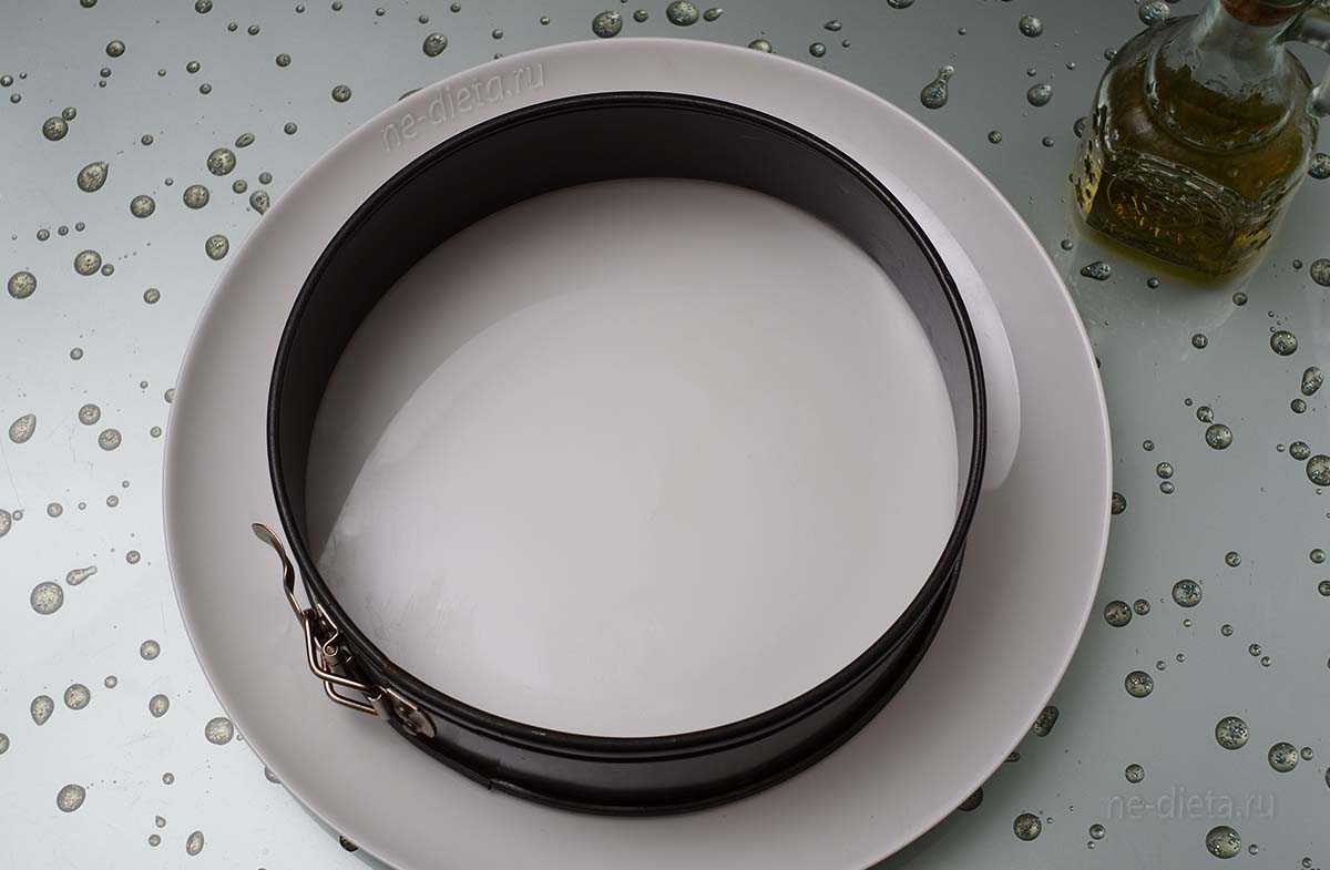Будем выкладывать салат не обычной горкой, а в форму, оформим как тортик. Если у вас нет готовой раздвижной формы — не беда. Можно свернуть такую из обычной фольги — сперва сворачиваем длинную полоску в несколько слоев, а затем — закручиваем ее в кольцо на блюде.