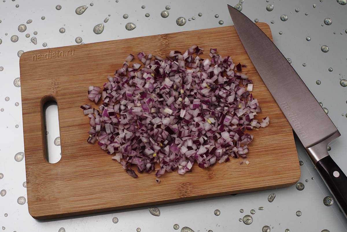 Теперь подготовим лук. Чтобы репчатый лук не пугал нас своей горечью — замаринуем его. Мелко порежем лук кубиками (или полукольцами — как вам больше нравится).