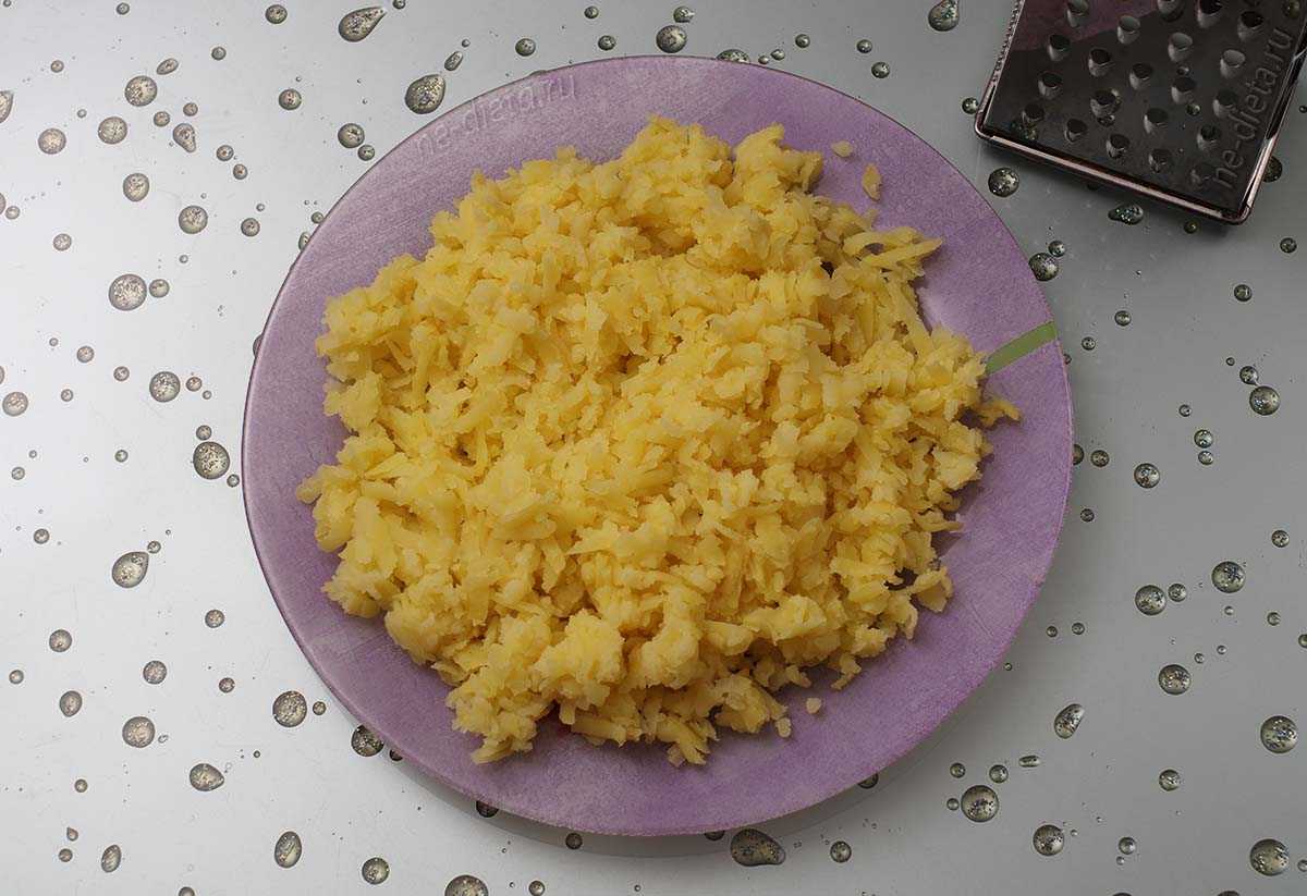 5. Половину картофеля натираем на крупной терке. Я тру прямо в форму, в которой будет подаваться наш салат на стол, высотой примерно в один палец. Это и будет первый слой, картофель слегка посыпаем солью и смазываем майонезом.