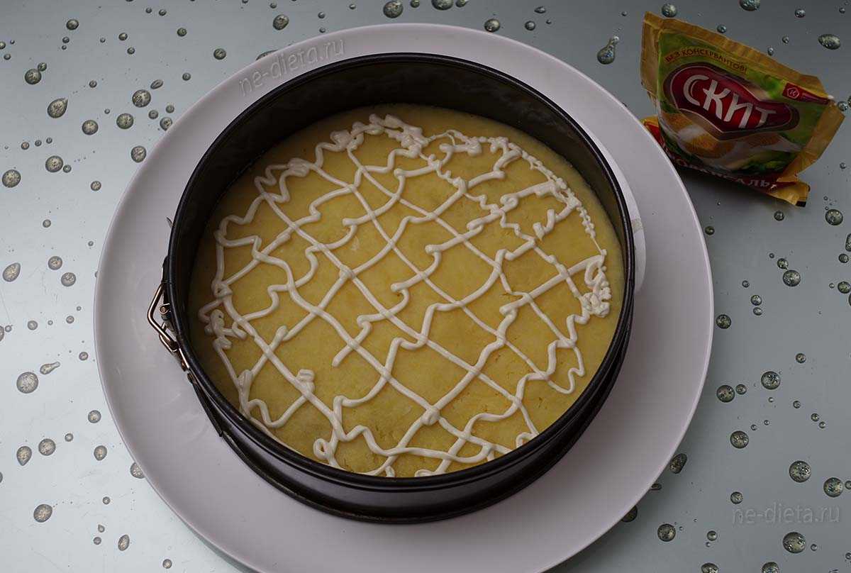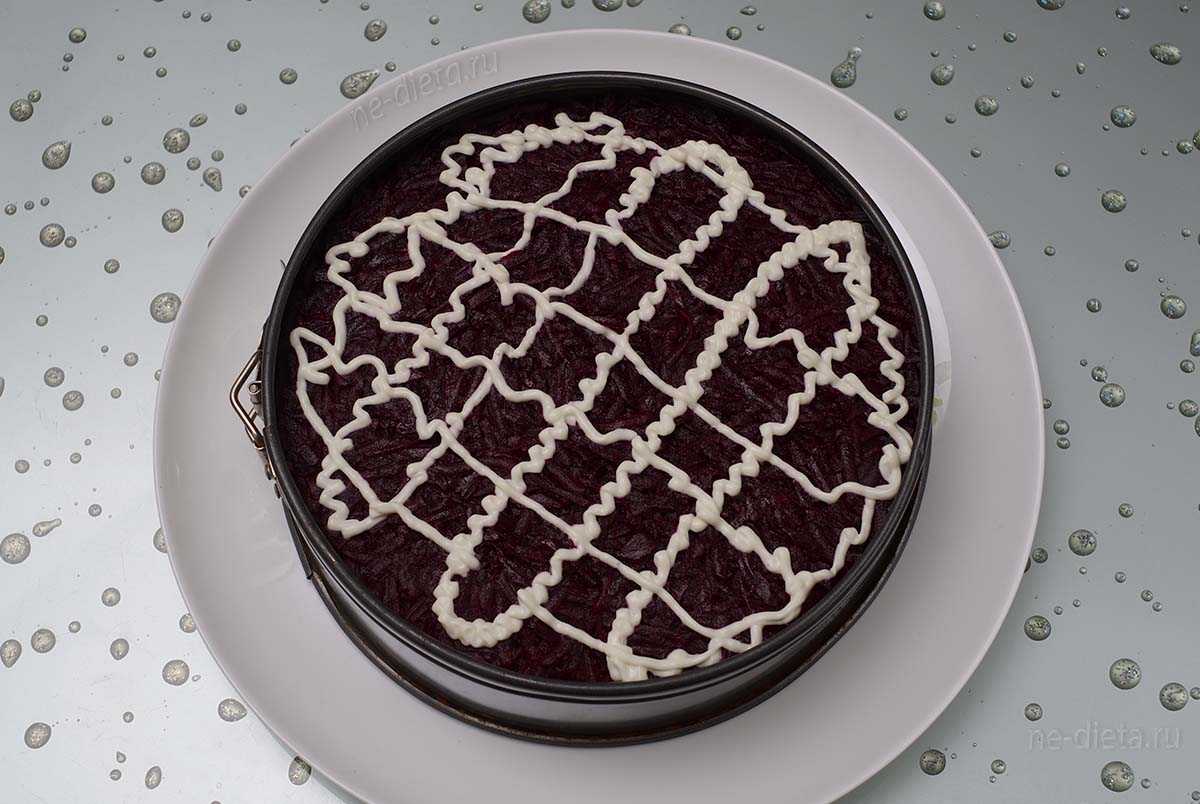 После чего идет слой свеклы, украшенный майонезной сеточкой.