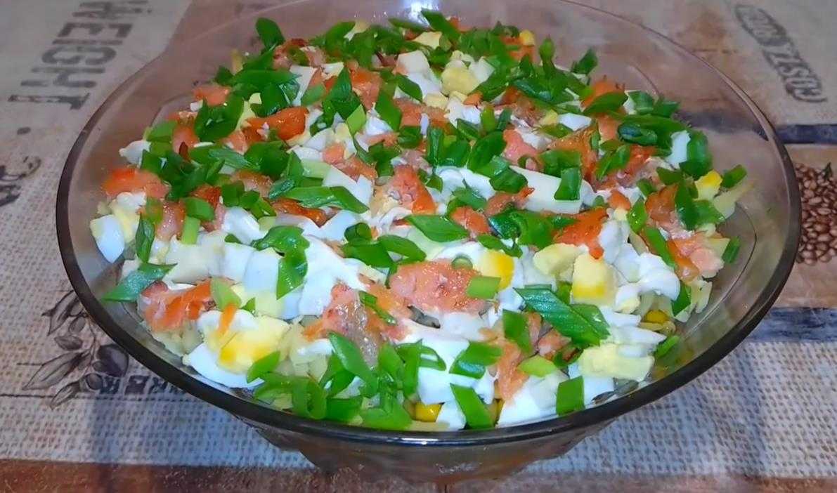 Это поистине праздничный салат, который позволяет насладиться вкусом деликатесной красной рыбы. Этот натуральный продукт идеально сочетается и с овощами, и с плавленым сыром, и с кукурузой. Закуска поражает интересным сочетанием сладких и соленых ингредиентов, она отличается своей пикантностью.