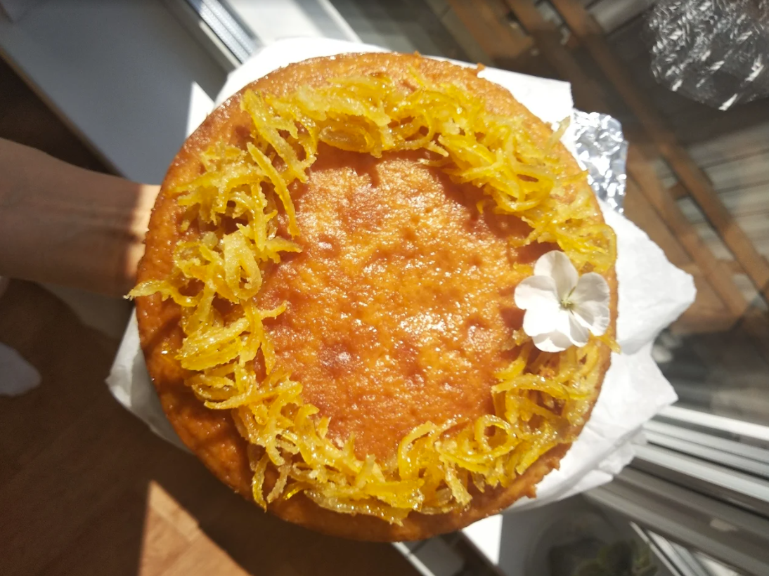 - Когда кекс будет готов, полить его лимонным сиропом и оставить так в чаше мультиварки на 10 минут. Потом уже можно его извлечь и дать полностью остыть. Украсить можно просто сахарной пудрой или ещё вот красиво смотрится декор с цукатами из апельсиновых корочек.