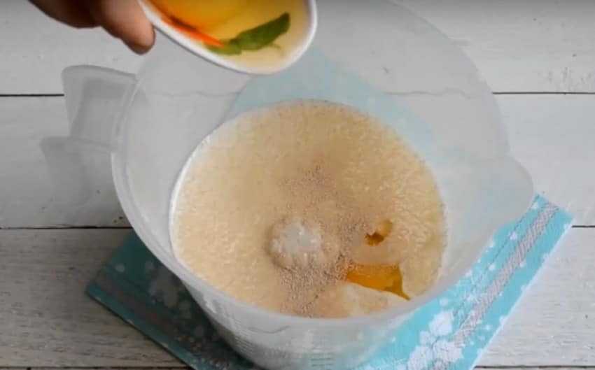 - В отдельную чашу выливается половина теплой воды и добавляется пара щепоток песка. В смесь мелко крошатся прессованные дрожжи.