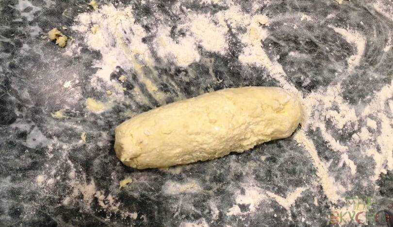 Затем скатать из теста колбаску, примерно 5 см в диаметре. Нарезать поперек на 8 равных частей.