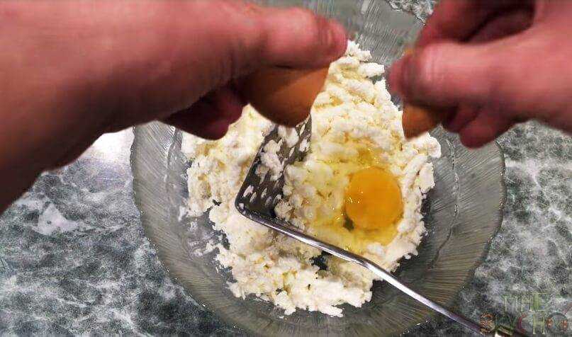 - Пересыпаем творог в миску. Вбиваем куриные яйца, добавляем соль, немного ванилина. Тщательно перетираем все вилкой.