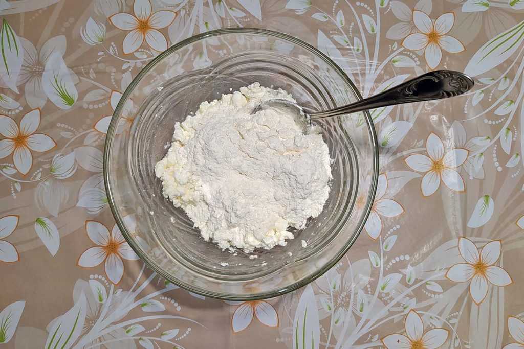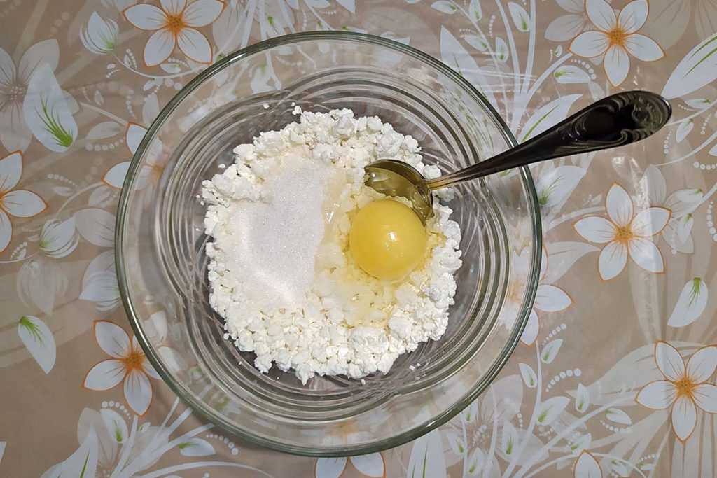 1. Тщательно размять творог вилкой. Присоединить сахар и яйцо. Перемешать.