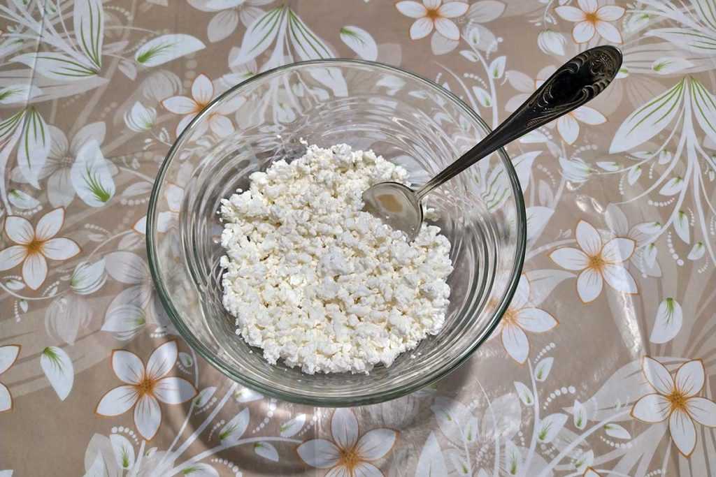 Творог нужно хорошо растереть или взбить в блендере, чтобы он стал однородным.