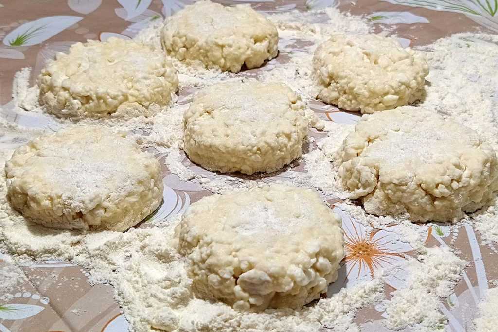 - Из получившегося теста налепите изделия округлой формы, обваляйте их в муке.