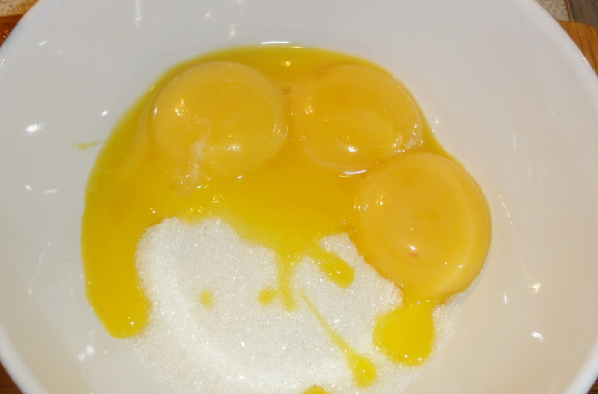 - В желтки высыпаем сахар и начинаем взбивать миксером до вязкой однородной консистенции, помните, что сахар полностью не растворится, т.е. кристаллики будут видны.
