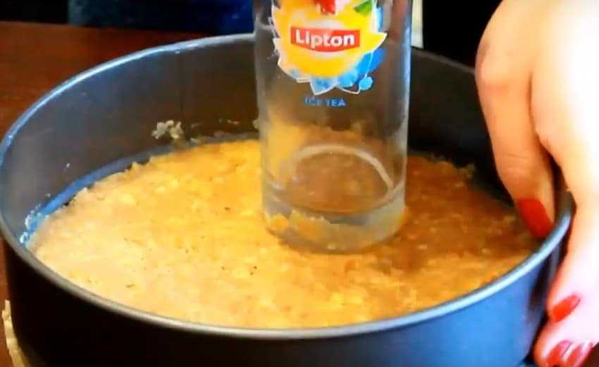 - Возьмем разъемную форму диаметром 20 см и устелем дно с боками — пергаментом. Насыплем равномерно по дну формы крошку и утрамбуем основу для торта стаканом. Затем уберем в морозилку на полчаса.
