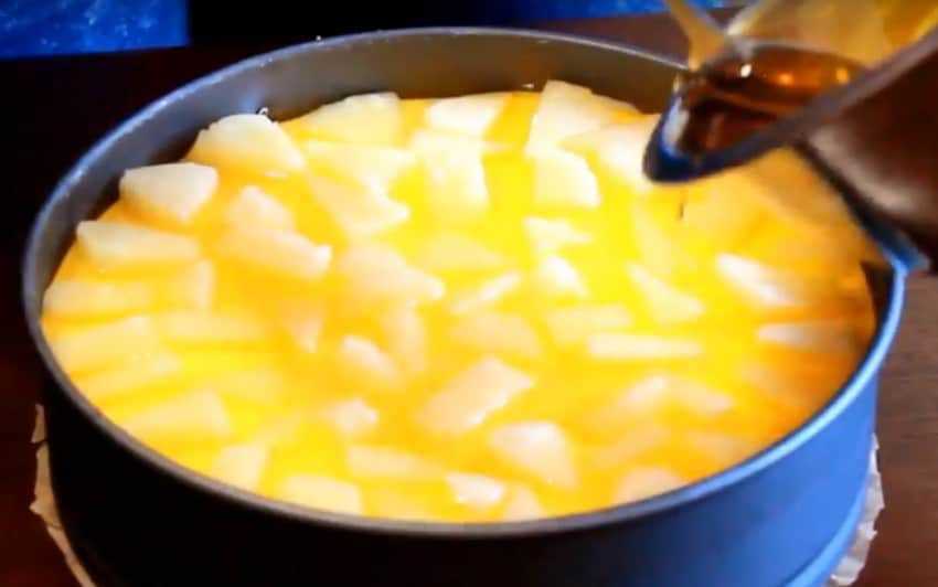 7. Достаньте форму, выложите на песочное основание кубики консервированного ананаса (половину банки).