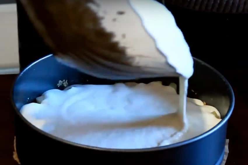 - Полученной смесью залить начинку. Затянуть пищевой пленкой и остудить в холодильнике в течение 6 часов.