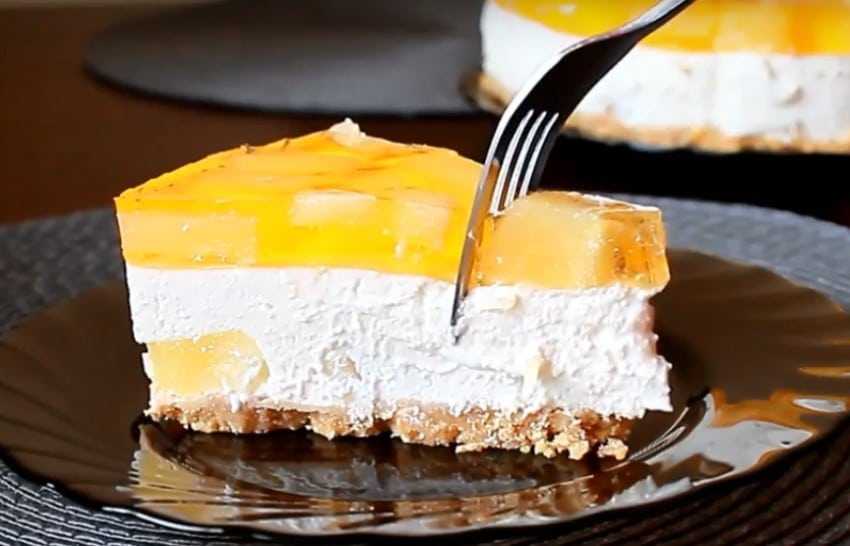 Готовый творожно-фруктовый десерт выглядит очень красиво на разрезе – настоящий чизкейк. Ананас придает блюду сочность и свежесть, а творог делает его очень нежным и легким.