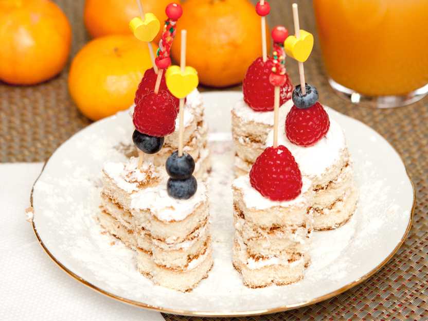 - Вырежьте кусочек бисквитного торта со стороной 4 на 4 см и вставьте палочку, сверху которой украсьте малиной и черникой.