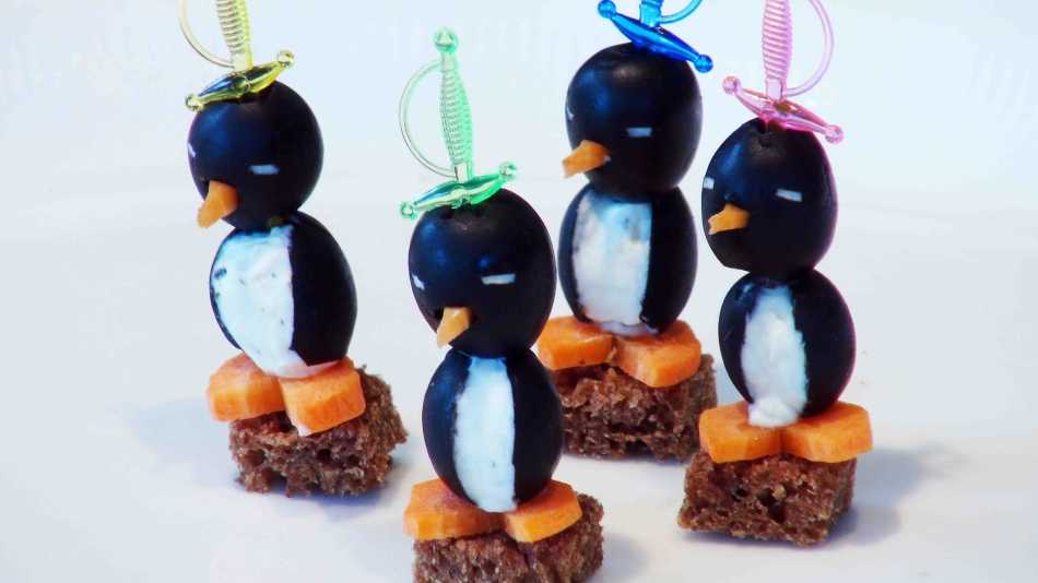 - Теперь нужно разрезать черную маслину без косточек до середины, чтобы она могла немного раскрыться, и наполним ее мягким сыром (филадельфия или плавленным.Эта маслина станет туловищем. Поочередно собираем нашего пингвина на шпажку.