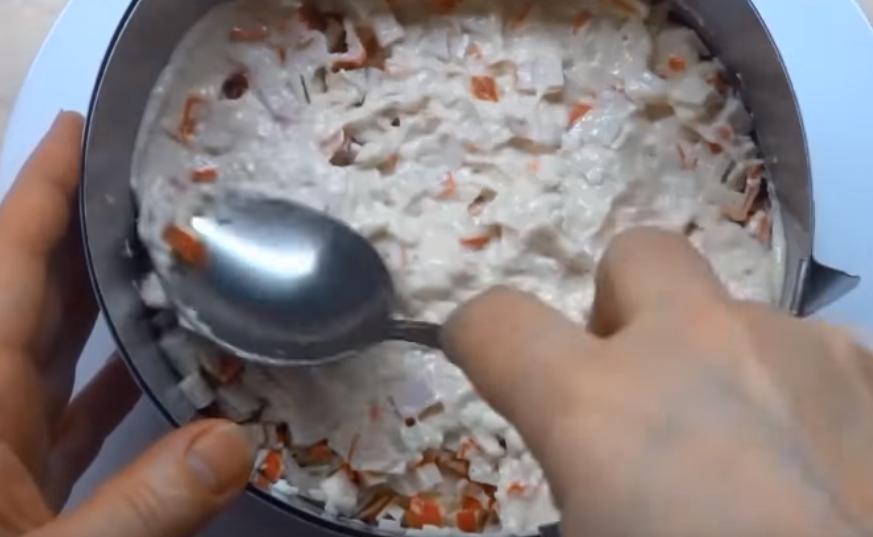 8.ΠΠ°ΡΠΈΠ½Π°Π΅ΠΌ ΡΠ±ΠΎΡΠΊΡ. ΠΠ° ΠΏΠ»ΠΎΡΠΊΡΡ ΠΏΠΎΡΡΠ΄Ρ Π²ΡΠΊΠ»Π°Π΄ΡΠ²Π°Π΅ΠΌ ΠΏΡΠΎΠΌΡΡΡΠ΅, ΠΈΠ·ΠΌΠ΅Π»ΡΡΠ΅Π½Π½ΡΠ΅ Π»ΠΈΡΡΡΡ ΡΠ°Π»Π°ΡΠ°. ΠΠ°ΠΊ Π²Π°ΡΠΈΠ°Π½Ρ, Π² ΡΠ΅Π½ΡΡ ΠΌΠΎΠΆΠ½ΠΎ ΠΏΠΎΡΡΠ°Π²ΠΈΡΡ ΠΊΡΡΠ³Π»ΡΡ ΡΠΎΡΠΌΡ, ΡΡΠΎΠ±Ρ ΠΏΠΎΠ»ΡΡΠΈΠ»ΠΎΡΡ ΠΊΠΎΠ»ΡΡΠΎ. ΠΡΠΊΠ»Π°Π΄ΡΠ²Π°Π΅ΠΌ ΡΠ°Π²Π½ΠΎΠΌΠ΅ΡΠ½ΠΎ ΠΌΠΎΡΠ΅ΠΏΡΠΎΠ΄ΡΠΊΡΡ ΠΈ ΠΏΠΎΠΌΠΈΠ΄ΠΎΡΡ. ΠΠΎΠ»ΡΡΠ°Π΅ΡΡΡ ΡΠΆΠ΅ ΠΎΡΠ΅Π½Ρ ΠΊΡΠ°ΡΠΈΠ²ΠΎ. ΠΡΡΠ°Π»ΠΎΡΡ ΡΠΎΠ»ΡΠΊΠΎ ΡΠ°Π²Π½ΠΎΠΌΠ΅ΡΠ½ΠΎ ΠΏΠΎΠ»ΠΈΡΡ ΡΠΎΡΡΠΎΠΌ, ΠΊΠΎΡΠΎΡΡΠΉ ΡΠΆΠ΅ ΠΏΠΎΠ΄ΠΆΠΈΠ΄Π°Π΅Ρ ΡΠ²ΠΎΠ΅Π³ΠΎ ΡΠ°ΡΠ° Π² Ρ ΠΎΠ»ΠΎΠ΄ΠΈΠ»ΡΠ½ΠΈΠΊΠ΅.