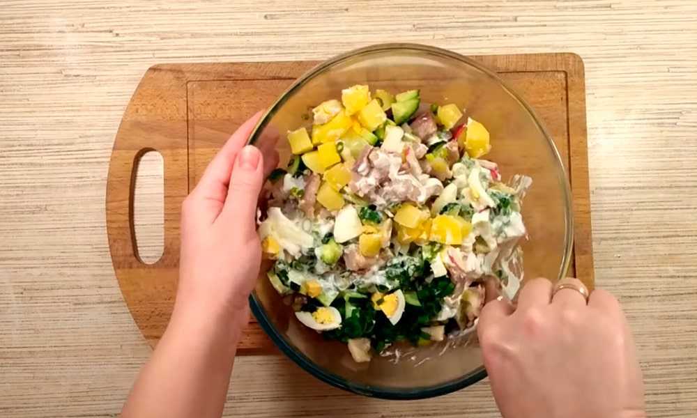 - Смешиваем все ингредиенты в салатнице.