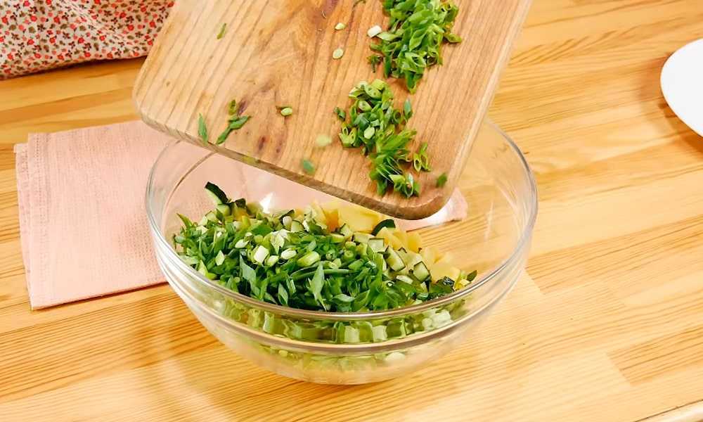 - Перышки зеленого лука промываем, обсушиваем и измельчаем колечками.