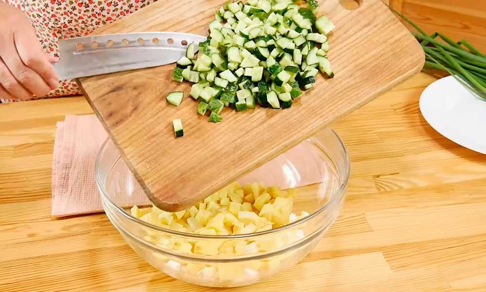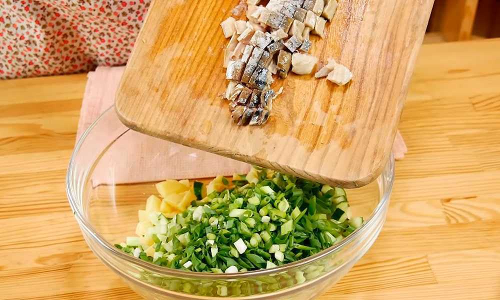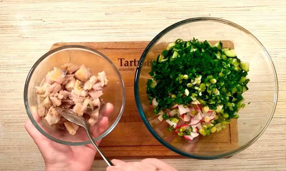Все компоненты нужно измельчить. Огурец, рыба и яйца нарезаются кубиками, а лук — тоненькими полосками, чтобы не перебивал вкус. В заготовку добавляются специи, приправы и зелень. Такое блюдо не требует дополнительной заправки, ведь масло, которое находится в консервах из рыбы, а также рассол от водорослей прекрасно справятся с этой задачей самостоятельно.