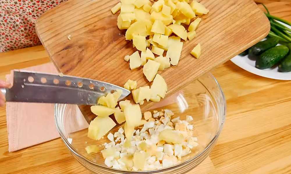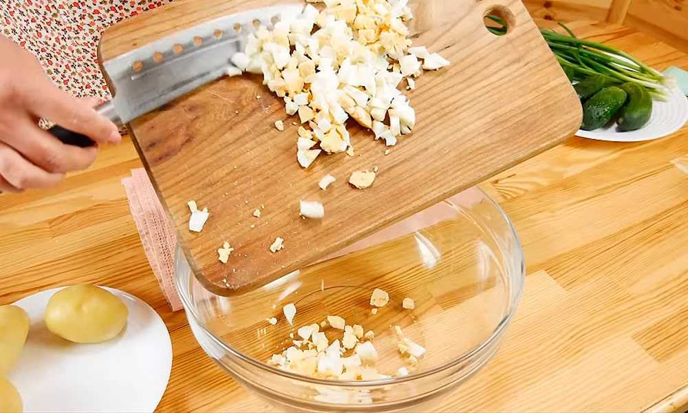 - Отвариваем яйца, чистим их и нарезаем небольшими кубиками.