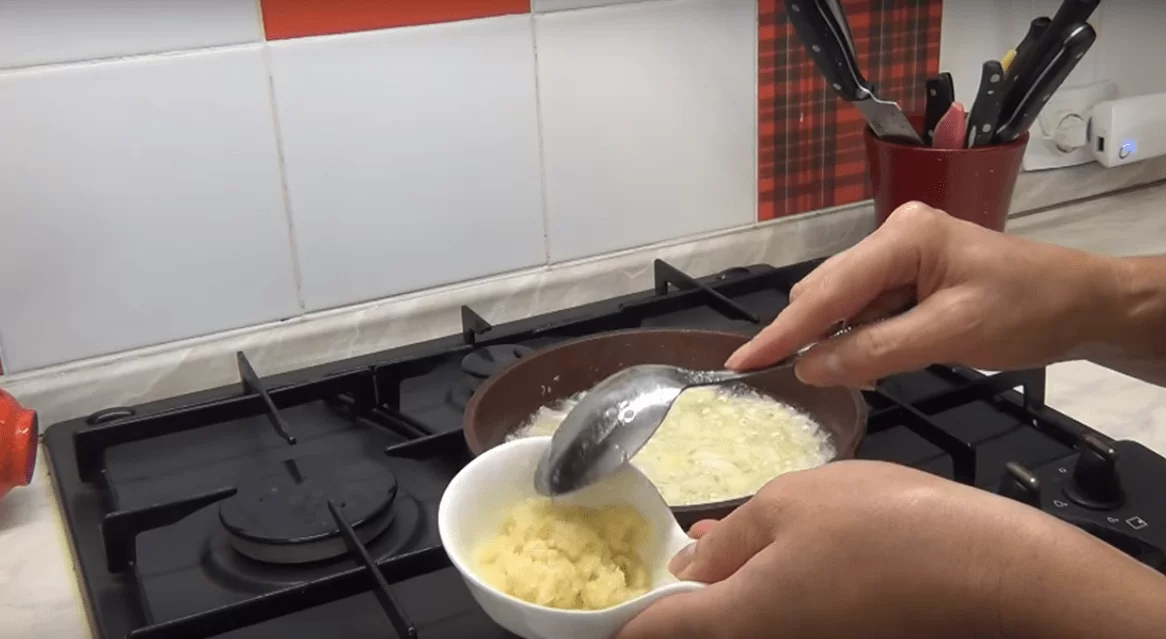 - Яйца, заранее отваренные вкрутую, разрезаем пополам. Желтки отправляем в отдельную емкость, они понадобятся позже. Белок нарезаем небольшими кусочками.