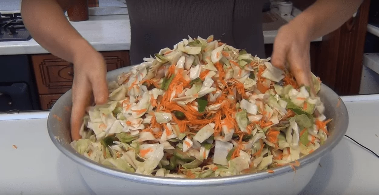 - Обязательно немного подсолите порезанную капусту и обомните руками, прежде чем добавить другие ингредиенты;