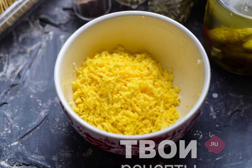 Яйца отварить привычным способом, очистить и разделить отдельно на белок и желток. Белок натереть в отдельную плошку на самой мелкой терке.