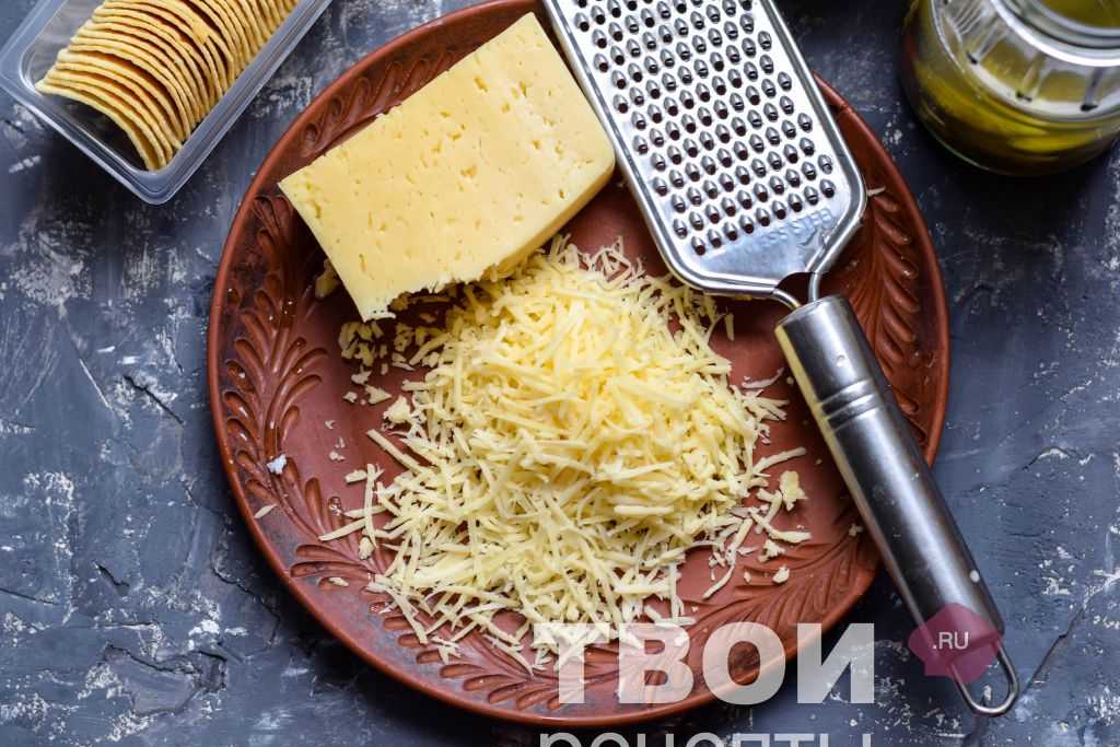 Твердый сыр выбрать любимого производителя и сорта, натереть мелкой стружкой. Благодаря мелкой стружке яиц и сыра, салат выйдет удивительно нежным и воздушным.