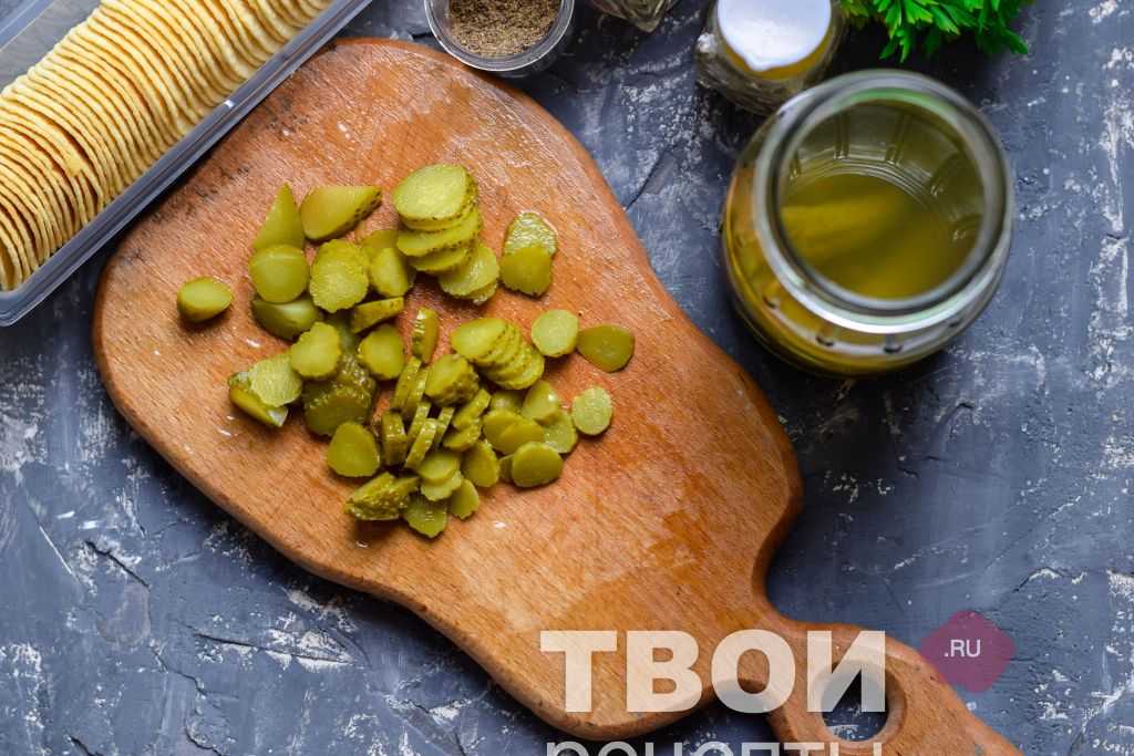 Корнишоны нарезать тонкими пластинками. Количество корнишонов можно увеличить.