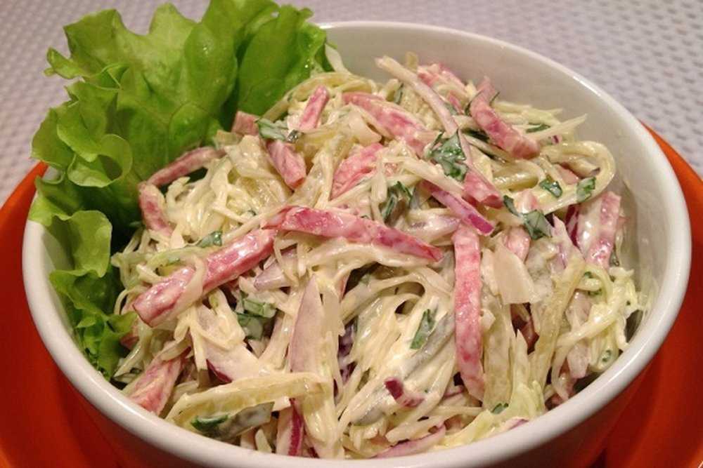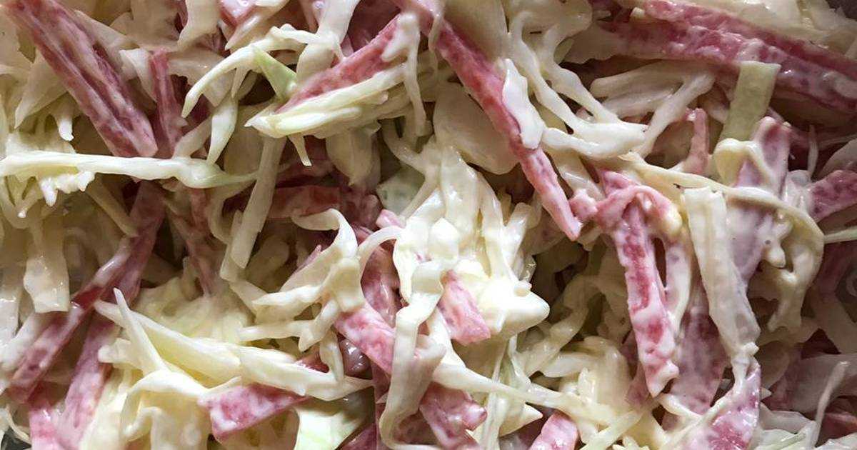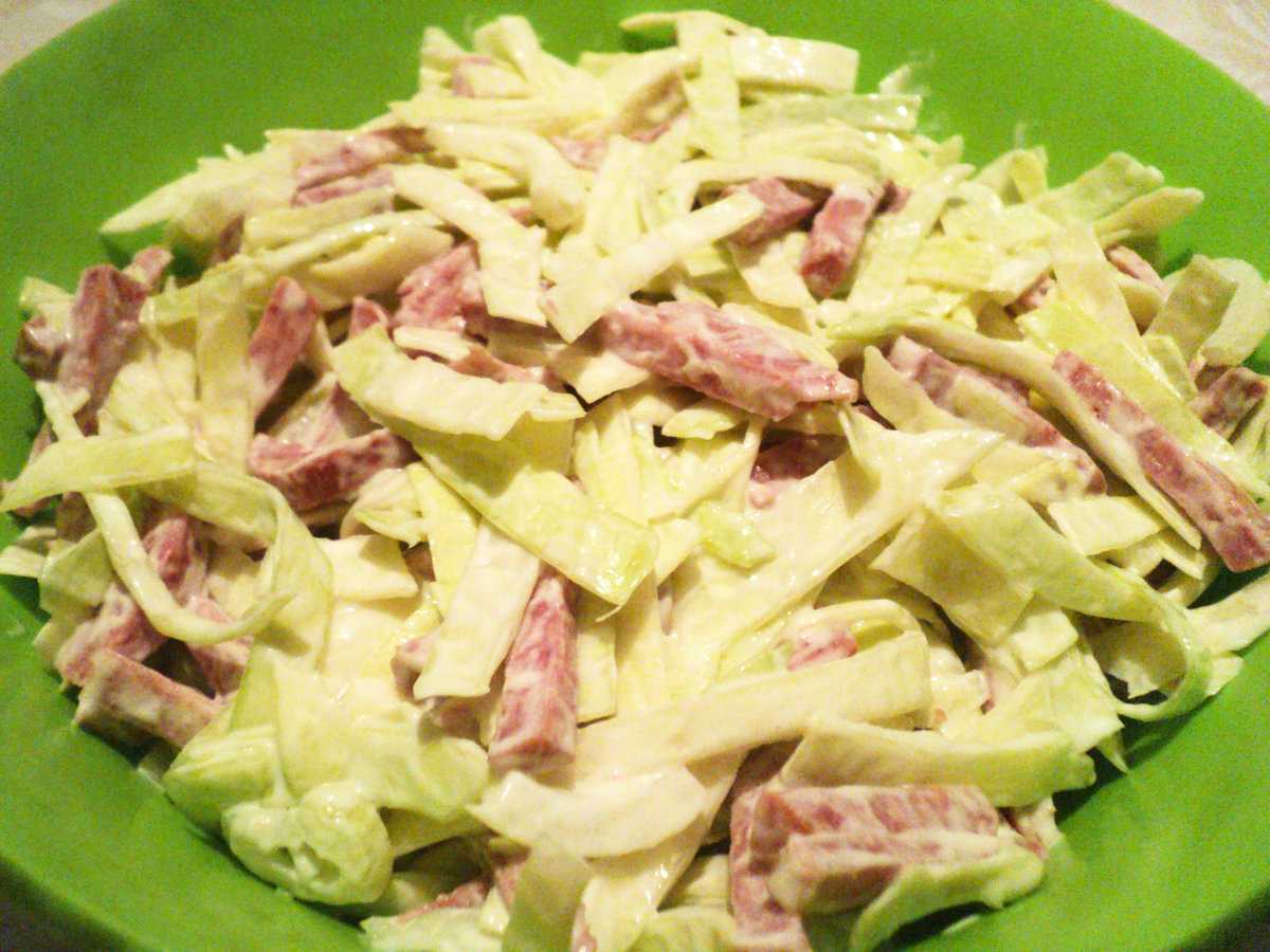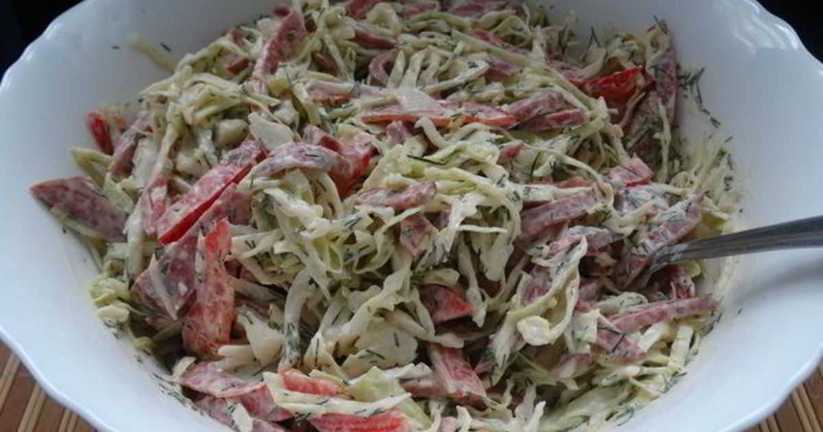 Сочетание свежих овощей, таких как капуста и огурец, является классическим. Разнообразив его вкусом копченой колбасы можно удивить близких оригинальным дополнением к основному гарниру.