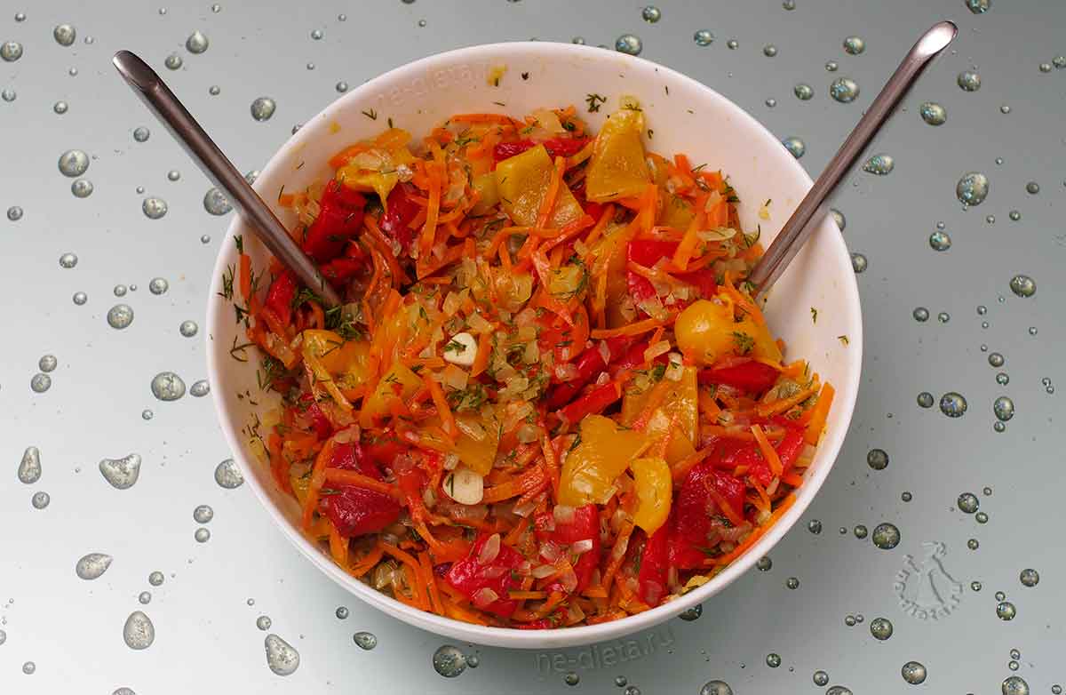 Совет! Этот необычный овощной салат можно приготовить из любого вида перца, однако, вкуснее он получается из мясистого импортного перца, который имеет более сладкий вкус, чем грунтовой. Кроме того, желательно использовать перцы хотя бы двух разных цветов, так как в этом случае салат будет не только великолепным на вкус, но и очень нарядным по своему внешнему виду.