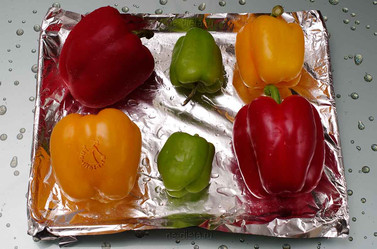 1. Для того чтобы приготовить вкусный, полезный и очень красивый салат с печеным болгарским перцем, прежде всего перец необходимо запечь. Для этого его надо вымыть и целиком выложить на противень, смазанный растительным маслом. Рекомендую дополнительно застелить противень фольгой, так как в этом случае он не испачкается, а фольгу можно просто снять и выбросить, облегчив себе хлопоты на кухне.