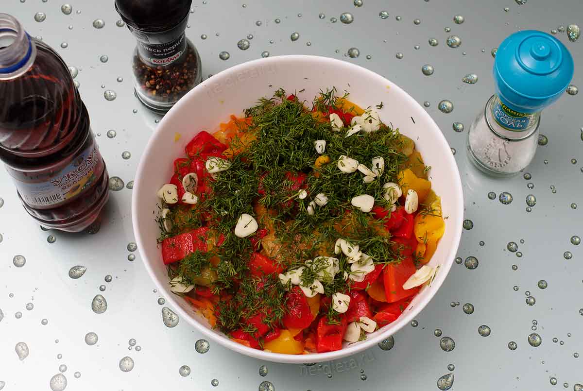 10. В миску выложить печеный перец, лук с морковью, укроп и чеснок и добавить в салат соль, острый перец и уксус.