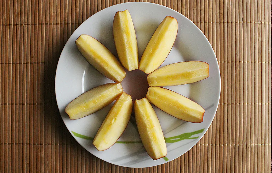 В нашем случае мы делили яблоко на дольки специальным приспособлением, но это не обязательно, если его не имеется в хозяйстве воспользуйтесь обычным острым ножом. Только не забудьте вырезать сердцевину.