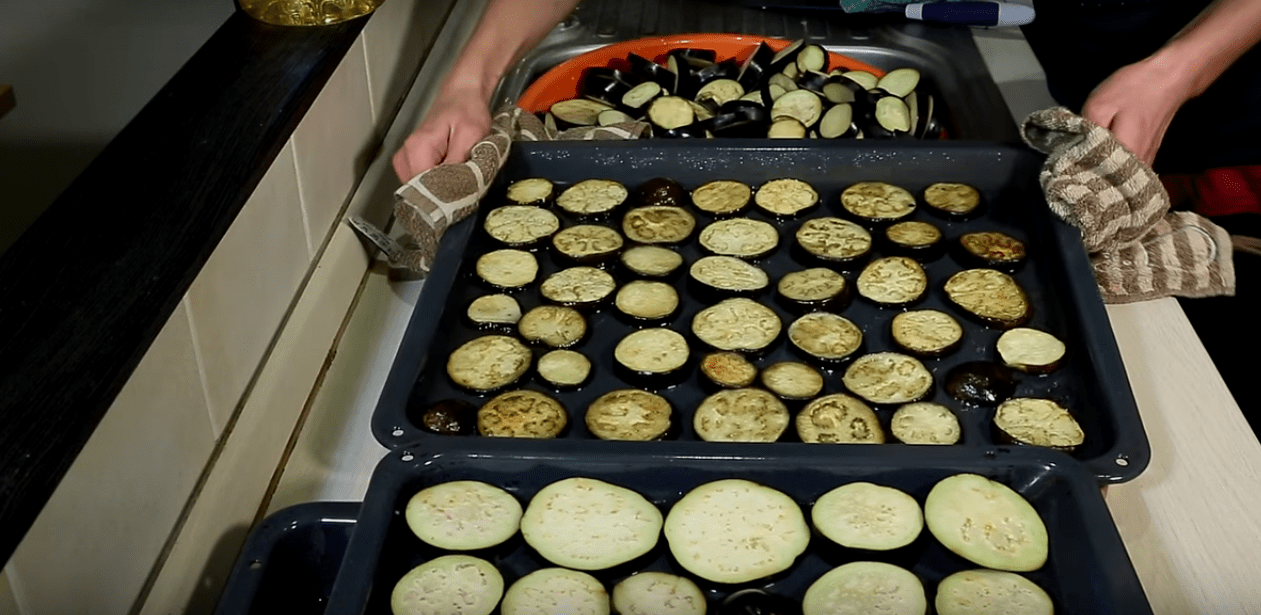 - Обжарьте на хорошо разогретой сковороде «синенькие» до образования золотистой корочки с 2 сторон;
