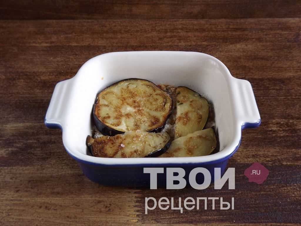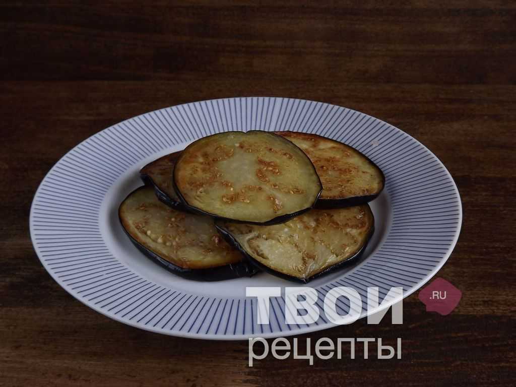 Разрезаем баклажан на тоненькие кусочки и присыпаем их солью. Оставляем постоять 15 минут, затем промываем, отжимаем и жарим с небольшим добавлением масла с двух сторон. Обсушиваем с использованием полотенец бумажного вида.