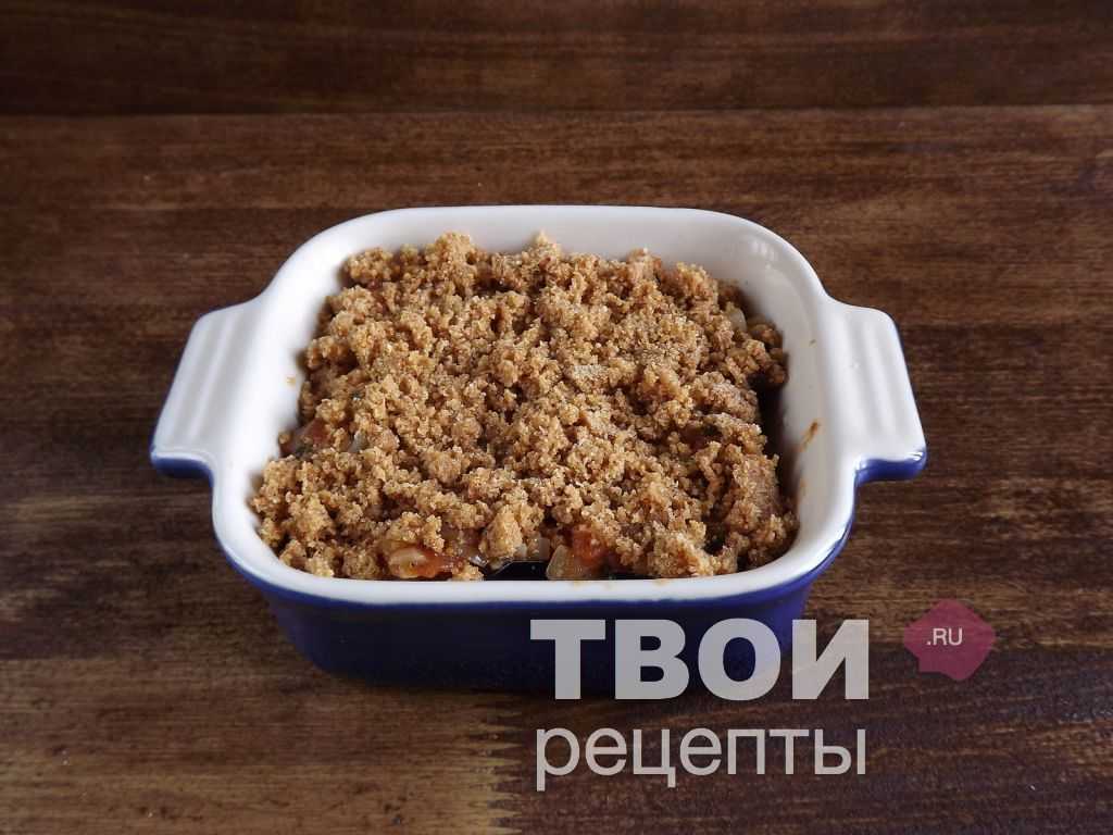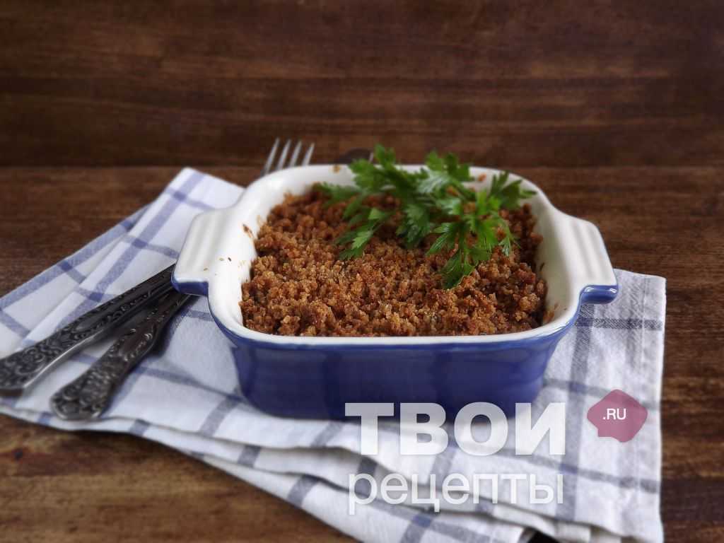 Сверху посыпаем сухарями, смешанными с небольшим количеством масла. Запекаем до золотистой корочки при 190С.