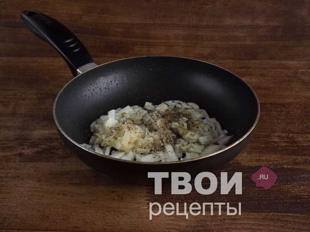 В сковороде разогреваем масло, кладем лук, чеснок и орегано. Жарим на среднем огне минут 10.