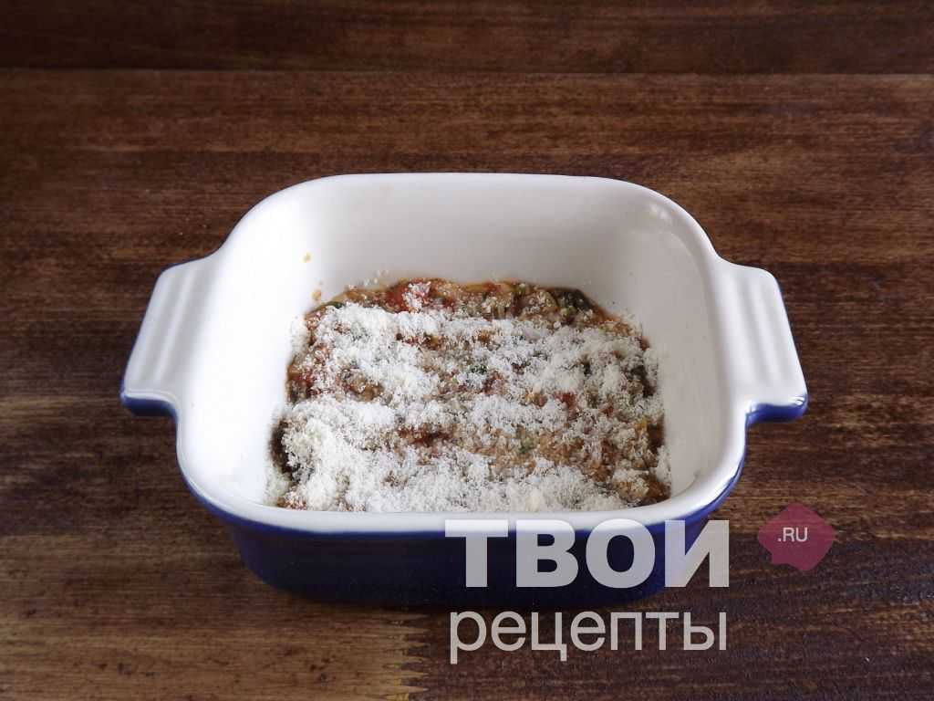 - Уложите сверху оставшиеся баклажаны, смажьте их соусом, посыпьте оставшимся сыром, натерев его мелко.