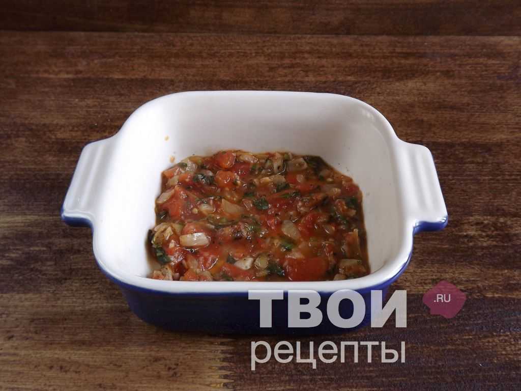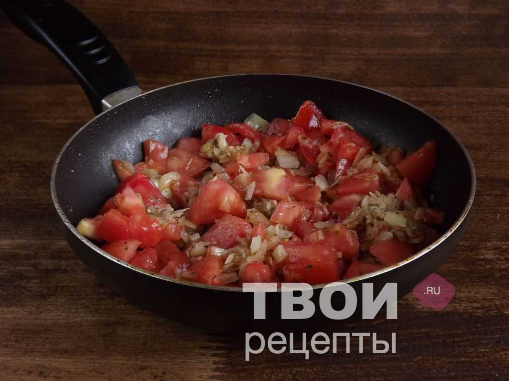 3. На небольшом огне на сковородке обжариваем лук, добавляем к нему мелко нарезанные помидоры, оставшуюся часть баклажана, перец, чеснок солим, приправляем специями, тушим пять минут и снимаем с огня.