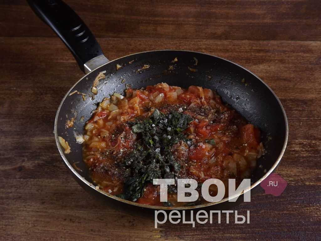 Готовый соус снимаем с огня. Солим, перчим, добавляем измельченный базилик, уксус и перемешиваем.