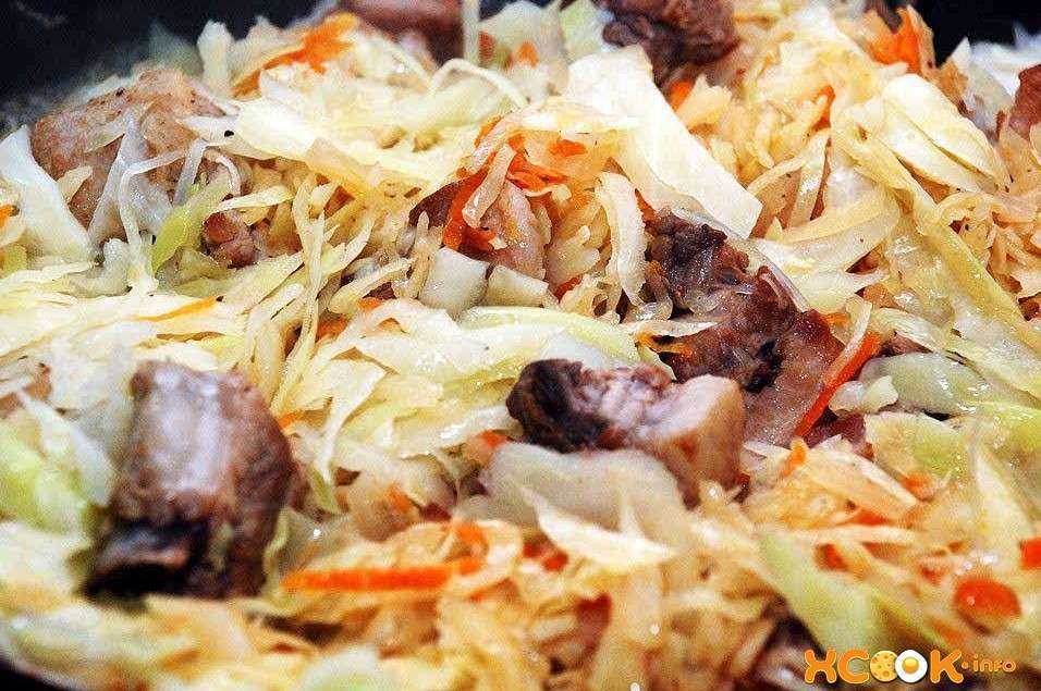 Тушим капусту со свиными ребрышками под закрытой крышкой в течение часа и еще плюс-минус 15-20 минут. Иногда помешиваем ингредиенты на сковороде или в сотейнике.
